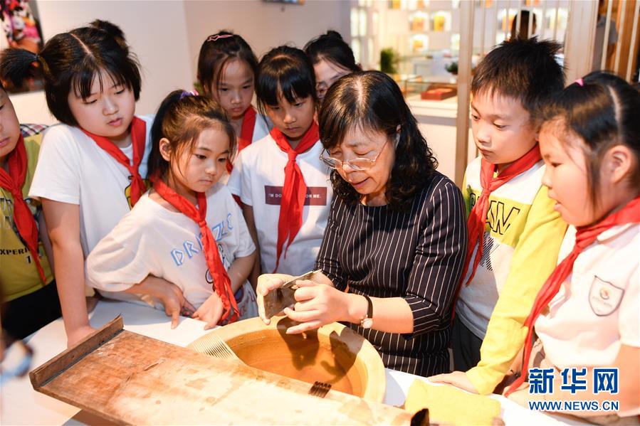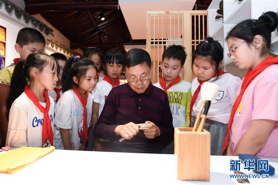 10月14日,小學(xué)生在非遺活態(tài)傳承館使用湖筆練習(xí)書(shū)法。 新華社記者 黃宗治 攝