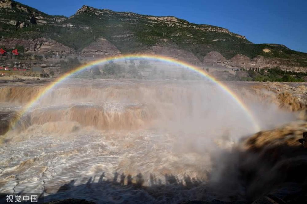 2019年8月17日,山西臨汾,游客在吉縣黃河壺口瀑布欣賞“彩虹門”景觀。