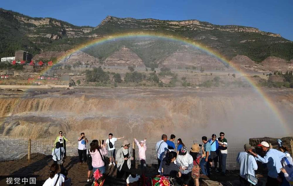 2019年8月17日,山西臨汾,游客在吉縣黃河壺口瀑布欣賞“彩虹門”景觀。
