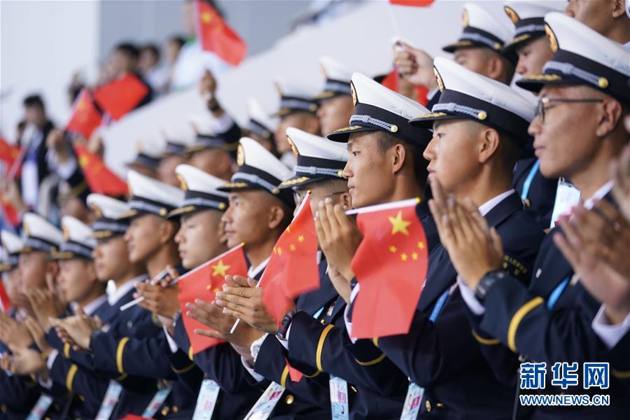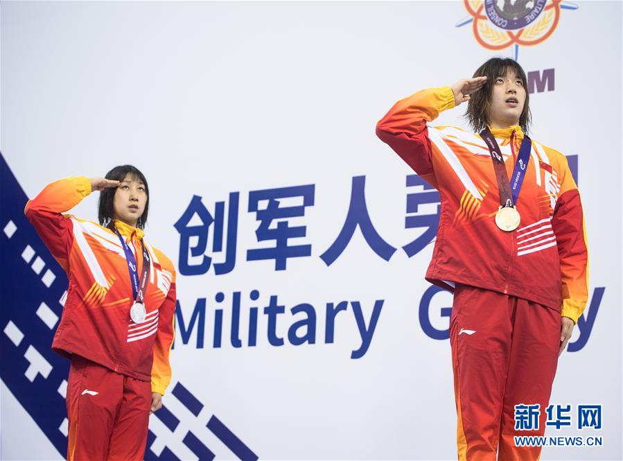 10月20日,中國隊(duì)選手吳慧敏(右)、包雪怡在升旗儀式上。當(dāng)日,在武漢舉行的第七屆世界軍人運(yùn)動(dòng)會(huì)水上救生項(xiàng)目女子50米假人救生決賽中,中國隊(duì)選手吳慧敏以33秒93的成績奪得冠軍,隊(duì)友包雪怡以35秒79的成績獲得亞軍。新華社記者肖藝九攝