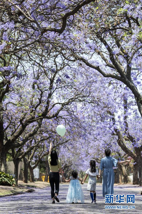 10月13日,在南非比勒陀利亞,行人從藍(lán)花楹樹下走過。
