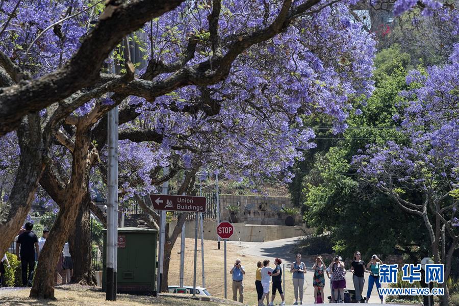10月20日,在南非比勒陀利亞,游人在藍(lán)花楹樹下賞花。新華社記者陳誠攝