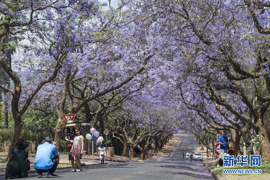 10月20日,在南非比勒陀利亞,游人在藍(lán)花楹樹下拍照。新華社記者陳誠攝