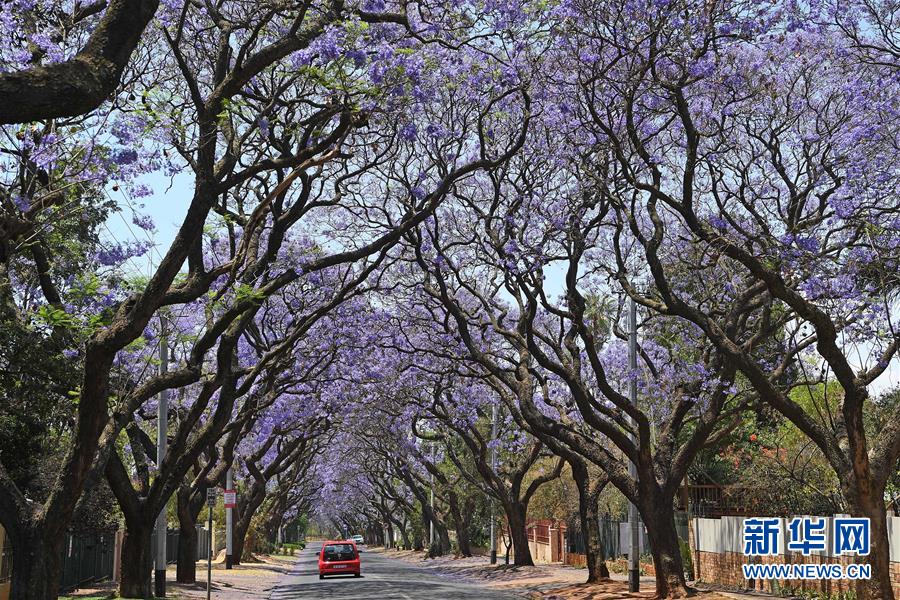 10月20日,在南非比勒陀利亞,車輛從藍(lán)花楹樹下駛過。新華社記者陳誠攝
