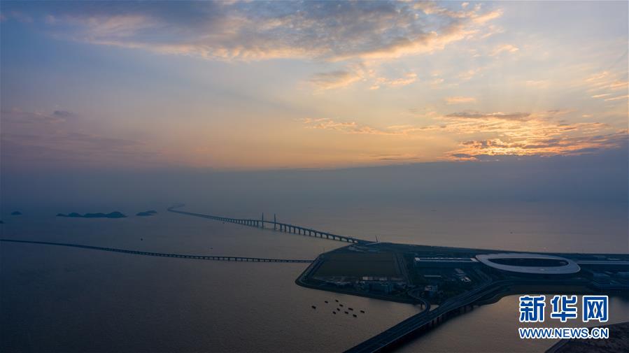 晨曦中的港珠澳大橋珠澳口岸人工島(10月24日無(wú)人機(jī)拍攝)。2018年10月23日,港珠澳大橋正式開(kāi)通。在這座圓夢(mèng)橋、同心橋、自信橋、復(fù)興橋開(kāi)通一周年之際,記者親自體驗(yàn)“一橋連三地、一日游三城”的悠閑與便利,于不同的旖旎風(fēng)光中自在游覽,在不同的城市風(fēng)貌間自如切換。新華社記者張金加攝