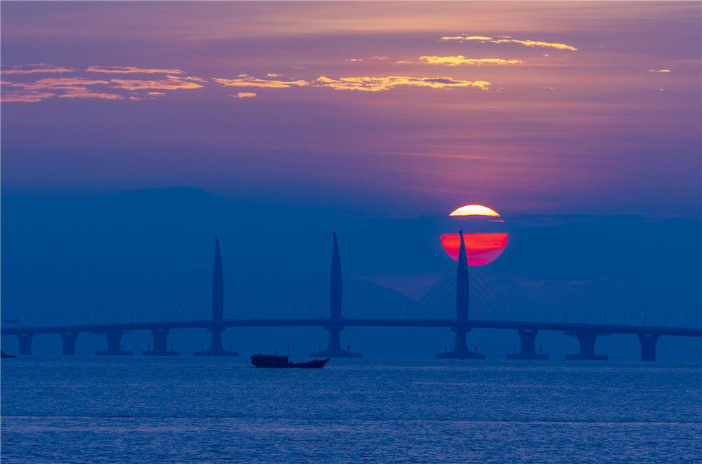 2018年10月22日早晨,從廣東珠海市的情侶路向東眺望,一輪紅日從東方冉冉升起,將港珠澳大橋映射得格外迷人?!俺壒こ獭备壑榘拇髽驅⒂?4日上午9時正式通車。張煒(香港分社)/中新社/視覺中國