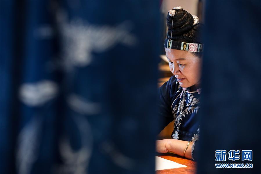 10月28日,楊芳在用蜂蠟繪制蠟染圖案。新華社記者 歐東衢 攝