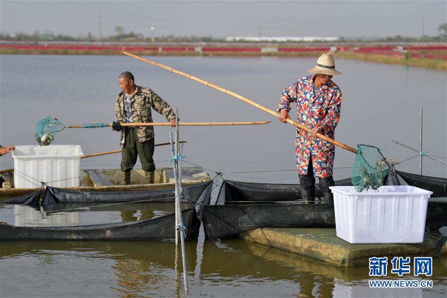 江西省南昌市新建區(qū)象山鎮(zhèn)河林村農(nóng)戶正在大閘蟹養(yǎng)殖基地進(jìn)行捕撈(10月29日攝)。 新華社記者 彭昭之 攝