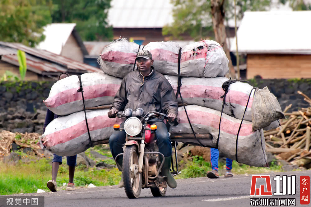剛果,工人們將裝滿木炭的麻袋放在摩托車上,從維龍加國家公園運(yùn)到剛果戈馬市。
