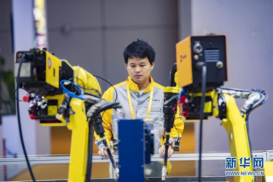 11月5日,在第二屆進博會裝備展區(qū),工作人員在滬工國際(香港)有限公司展臺前查看點焊機器人設備運行情況。新華社記者普布扎西攝