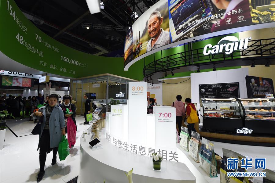 11月10日,在第二屆進(jìn)博會(huì)食品及農(nóng)產(chǎn)品展區(qū),參觀者在美國(guó)嘉吉公司展臺(tái)參觀。新華社記者范培珅攝