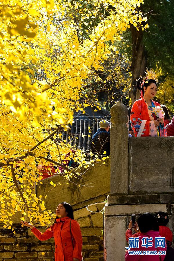 11月11日,人們?cè)诖笥X(jué)寺內(nèi)的古銀杏樹(shù)旁留影。新華社記者尹棟遜攝
