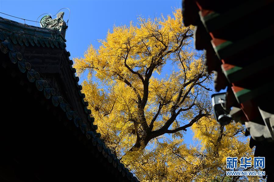 11月11日,大覺寺內(nèi)的古銀杏與建筑相映成趣。新華社記者尹棟遜攝