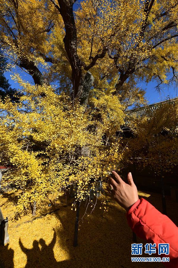 11月11日,人們?cè)诖笥X寺內(nèi)觀賞古銀杏樹。新華社記者尹棟遜攝