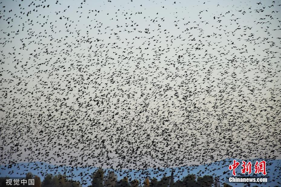 近日,土耳其穆什,椋鳥群遷徙途中,黑壓壓一片遮擋天空。圖片來源:視覺中國