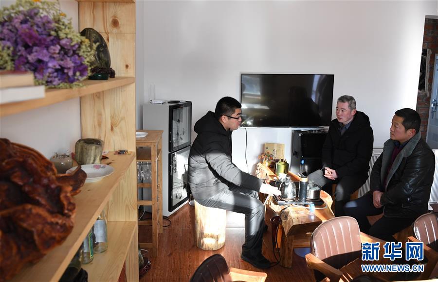 11月24日,在新疆吉木乃縣草原石城景區(qū)附近的吉木乃縣托斯特鄉(xiāng)塔斯特村,鄉(xiāng)黨委書記王繼江(左)與村民一起討論冬季游客接待事宜。新華社記者沙達提攝