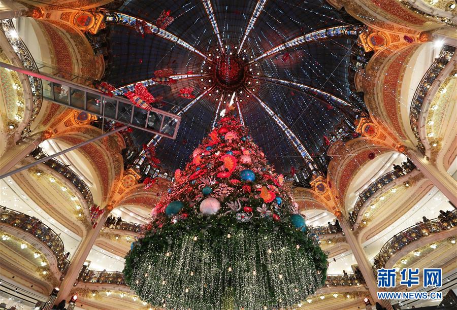 11月24日,在法國巴黎老佛爺百貨公司,人們在玻璃走廊上參觀點燈后的巨型圣誕樹。  新華社記者高靜攝