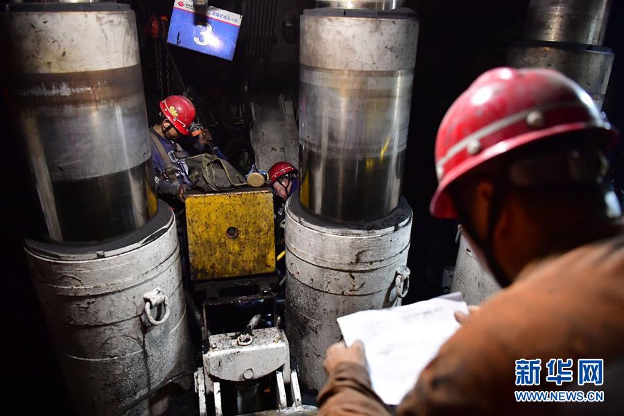 11月26日,在上灣煤礦12402綜采面內,工作人員對照清單檢修液壓支架。 新華社記者 邵瑞 攝