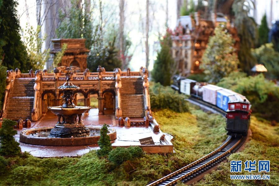 11月26日,在美國紐約植物園節(jié)日小火車展上,一輛模型小火車駛過紐約中央公園貝塞斯達(dá)噴泉和臺(tái)階微縮模型。新華社記者韓芳攝