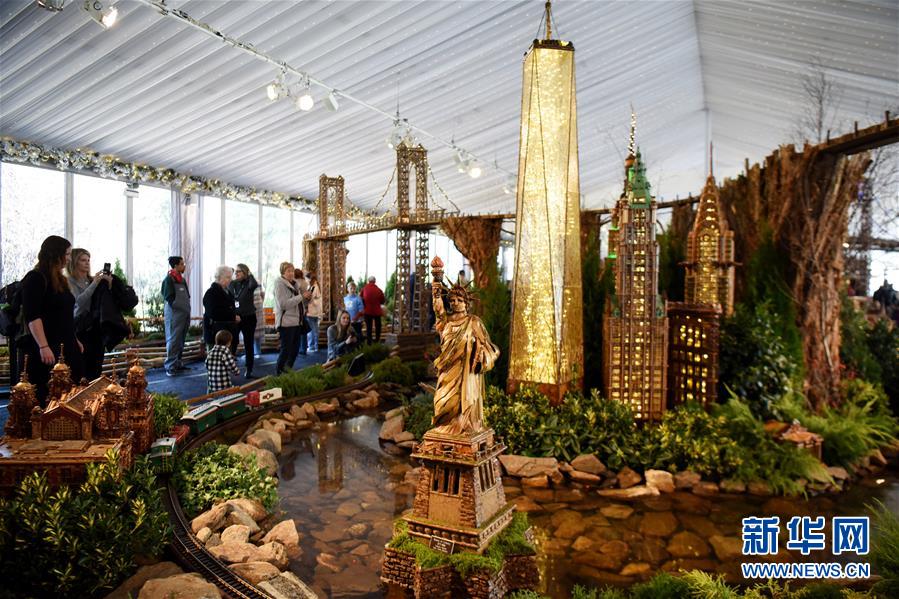 11月26日,在美國紐約植物園節(jié)日小火車展上,游客觀看自由女神像和曼哈頓高樓微縮模型。新華社記者韓芳攝