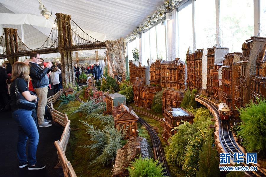 11月26日,在美國(guó)紐約植物園節(jié)日小火車展上,游客觀看模型小火車和紐約微縮景觀。新華社記者韓芳攝