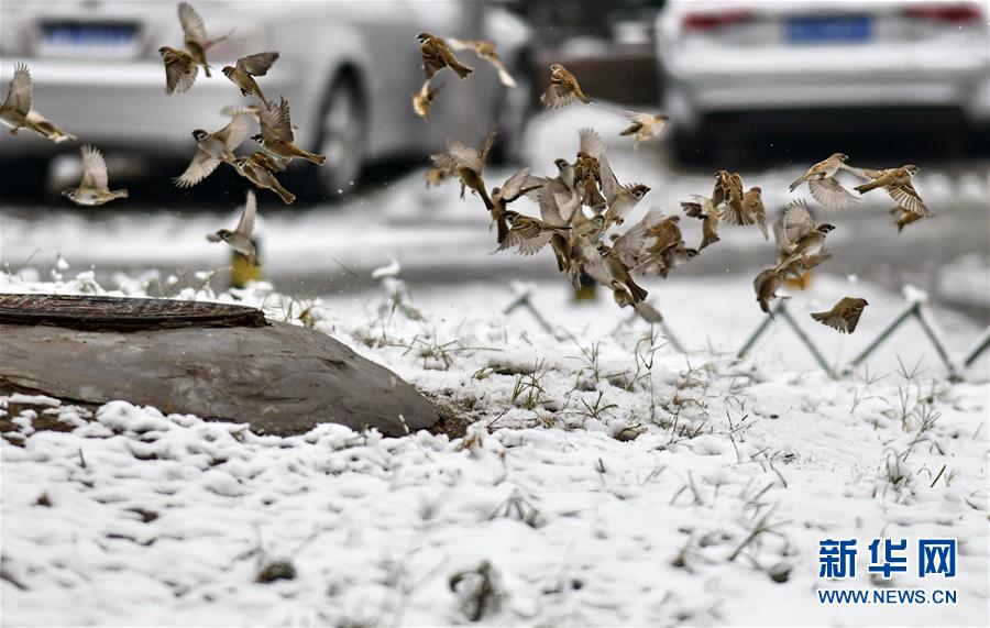 11月30日拍攝的在雪中覓食的麻雀。  新華社記者 李欣 攝