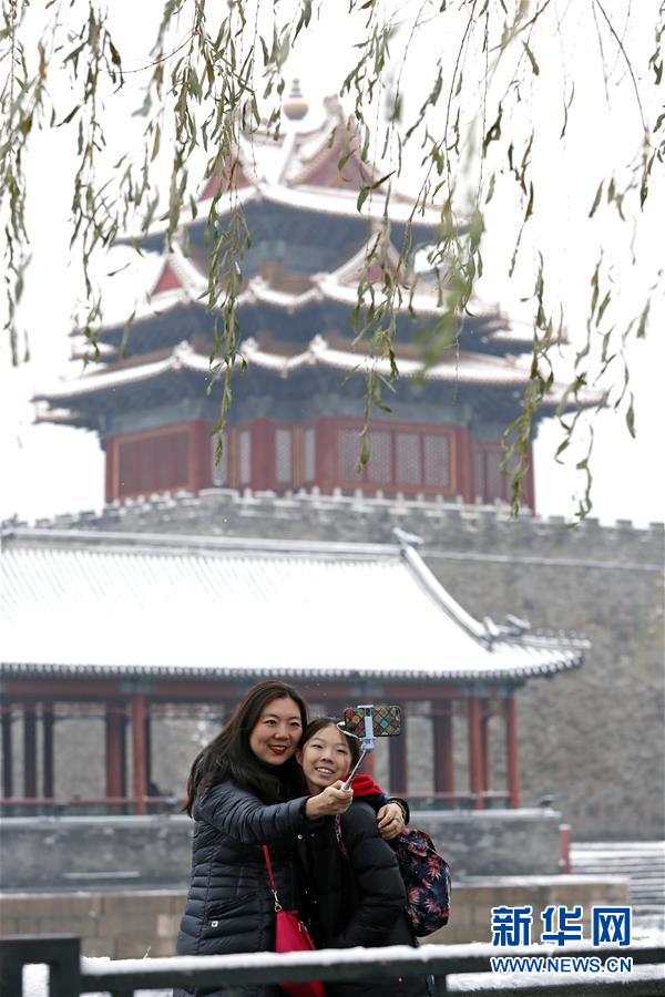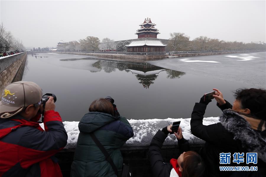 11月30日,人們?cè)谘┖蟮墓蕦m角樓附近拍照。  新華社記者 沈伯韓 攝
