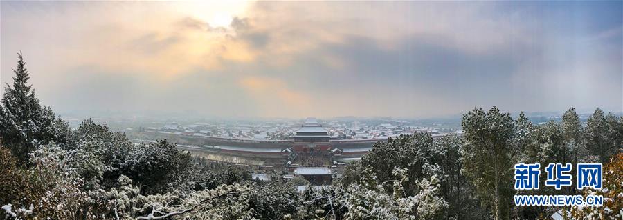 這是11月30日在北京景山公園萬春亭拍攝的雪后故宮(手機(jī)全景模式拍攝)。  新華社記者 沈伯韓 攝