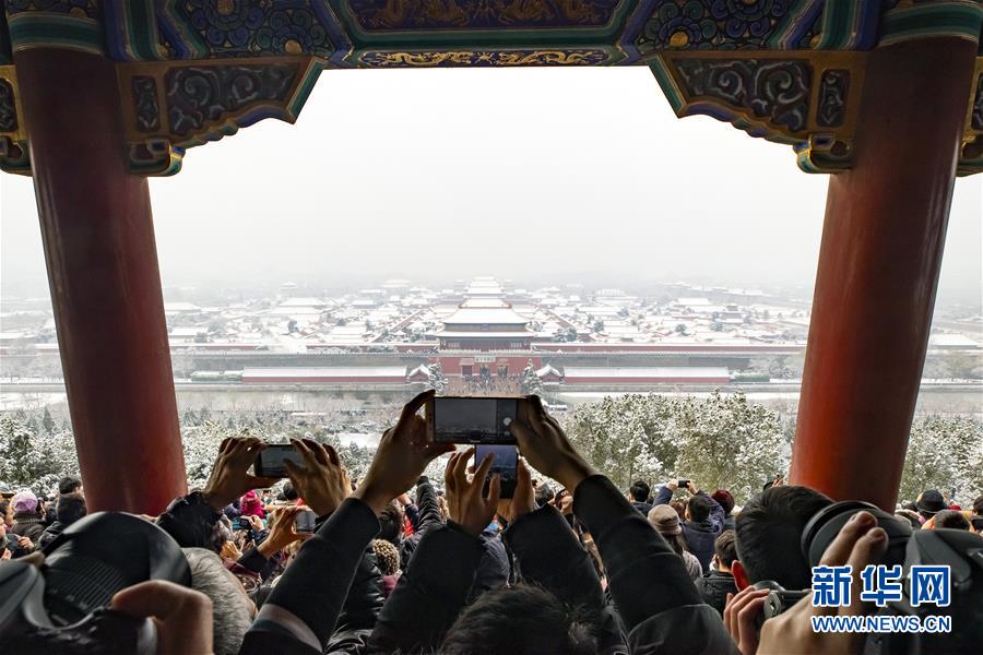 11月30日,人們?cè)诒本┚吧焦珗@的萬春亭拍攝雪后的故宮。  新華社記者 沈伯韓 攝