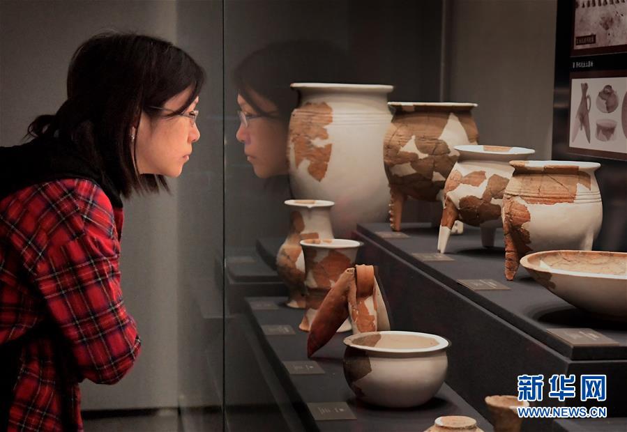 10月19日,參觀者在二里頭夏都遺址博物館內觀看展出的陶器。新華社記者李安攝