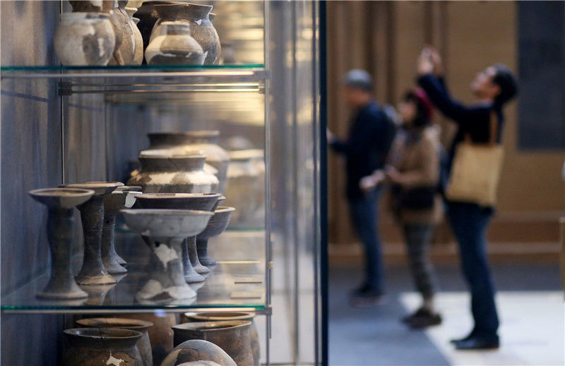 參觀者在二里頭夏都遺址博物館內觀看展出的陶器(10月19日攝)。新華社記者李安攝