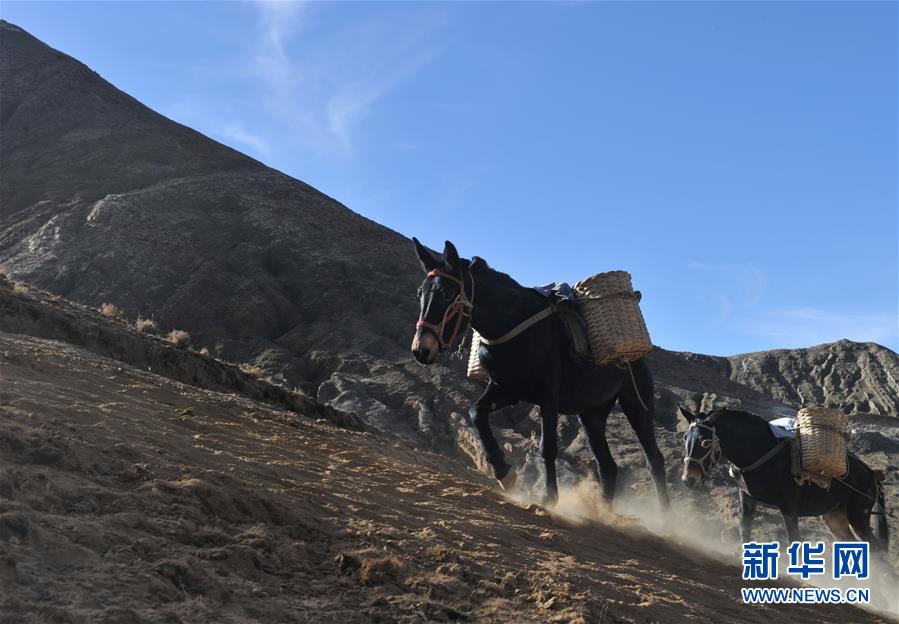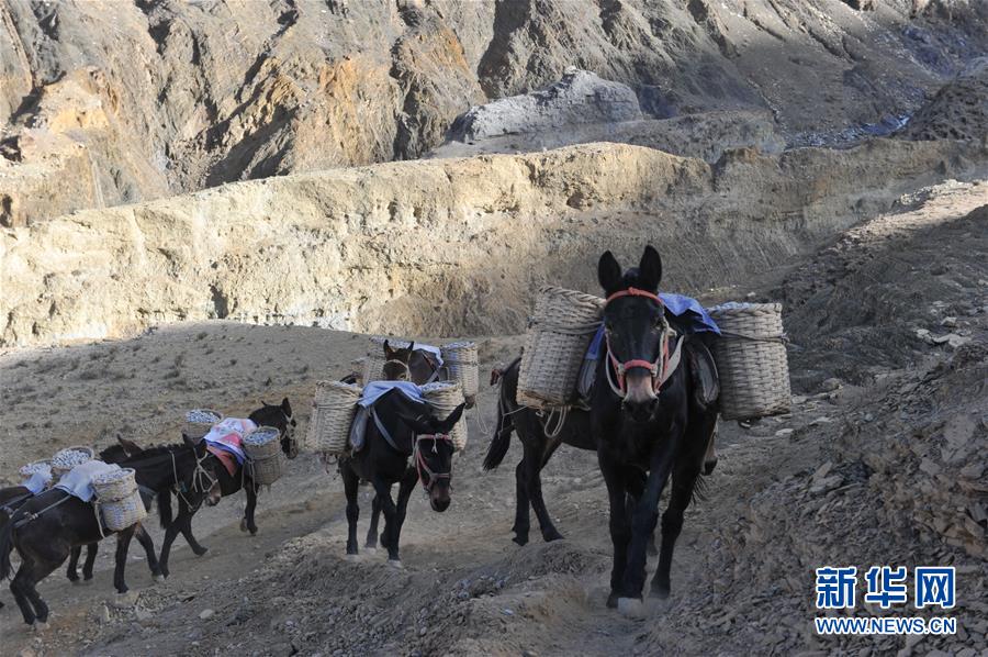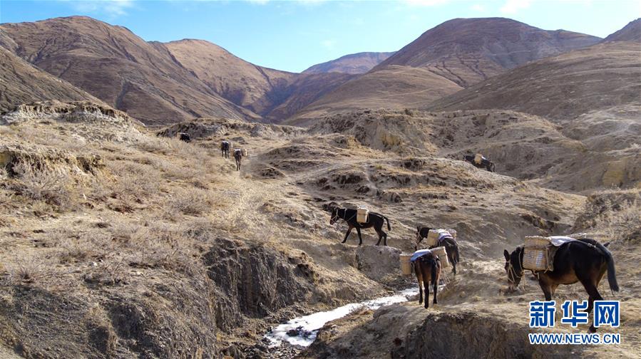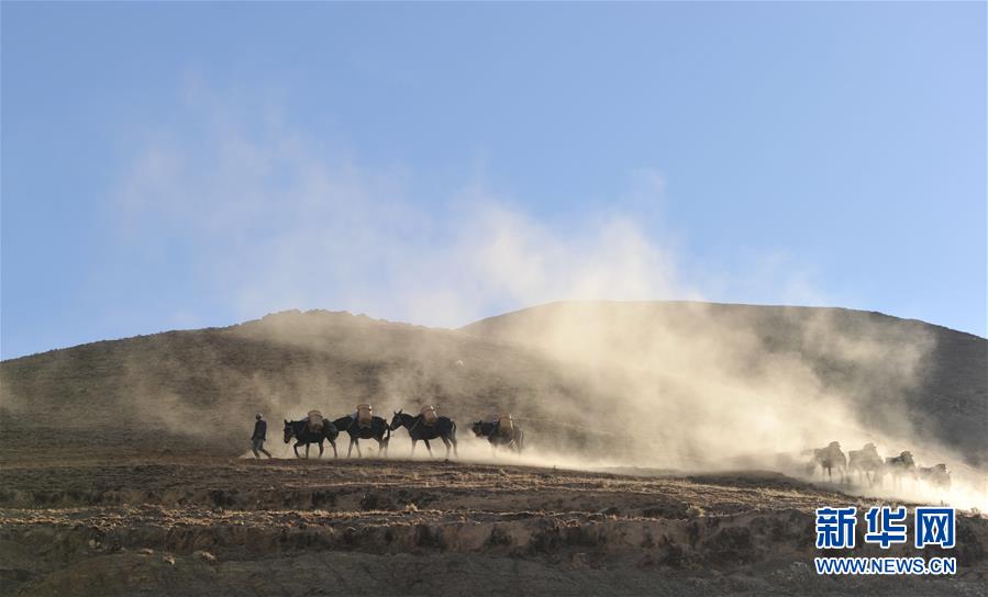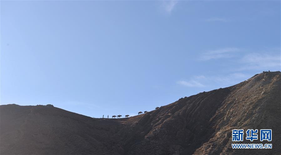 12月6日,騾馬隊(duì)馱負(fù)工程物料前往山頂塔基施工現(xiàn)場(chǎng)。新華社記者侯捷攝