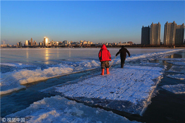 2018年12月8日,最低氣溫零下22度,哈爾濱市江北公路大橋東側(cè)的江面上,工人們正在從江中撈取冰塊,裝車運(yùn)往景區(qū)制作冰燈、冰雕。現(xiàn)場(chǎng),工人先是用電鋸、鐵釬將冰分割成半米多寬,一米多長(zhǎng)的冰塊,接著將其拉出水面。等候在旁的叉車上前,將冰裝上運(yùn)冰的卡車,之后裝滿冰塊的卡車駛往景區(qū)。