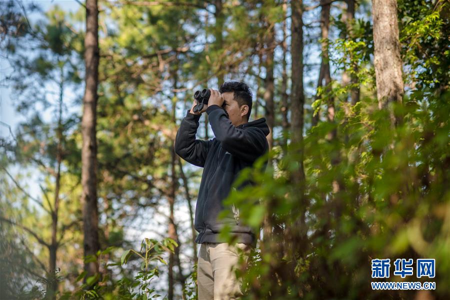 羅康在哀牢山的松樹林里觀測(cè)鳥類(12月12日攝)。 新華社記者 胡超 攝
