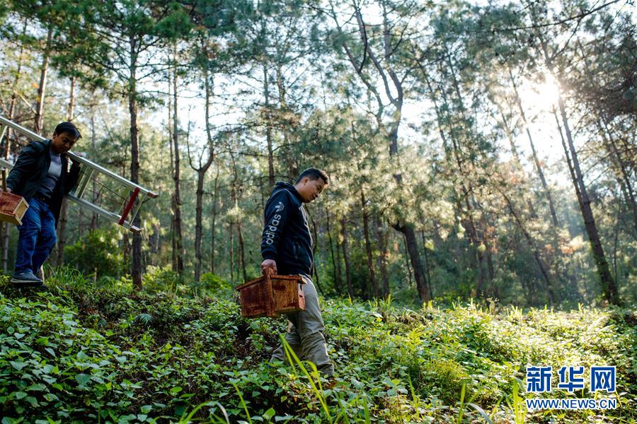 羅康(上)在哀牢山的松樹林里安裝人工鳥巢(12月12日攝)。 新華社記者 胡超 攝
