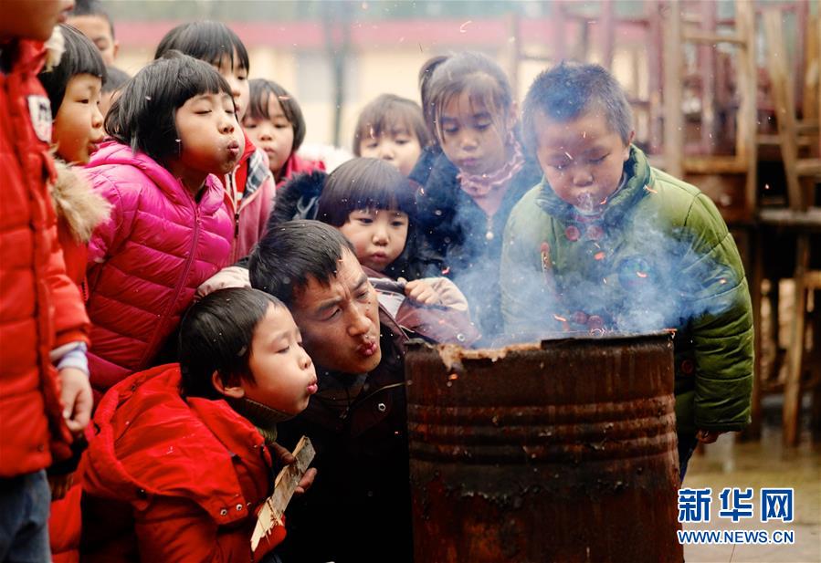 1月3日,在江西省鷹潭市余江區(qū)春濤鎮(zhèn)黃泥小學(xué),老師章站亮(前右)和學(xué)生們一起生火。由于生火用的材料均是廢棄的桌椅或者枯葉,點(diǎn)火后得不停地靠嘴吹氣才能燒得旺盛。2018年9月,44歲的章站亮來到黃泥小學(xué)擔(dān)任校長,黃泥小學(xué)物質(zhì)條件艱苦,沒有食堂。他每月自費(fèi)買菜為孩子們義務(wù)加餐,被孩子們稱為“廚神爸爸”。新華社記者胡晨歡攝
