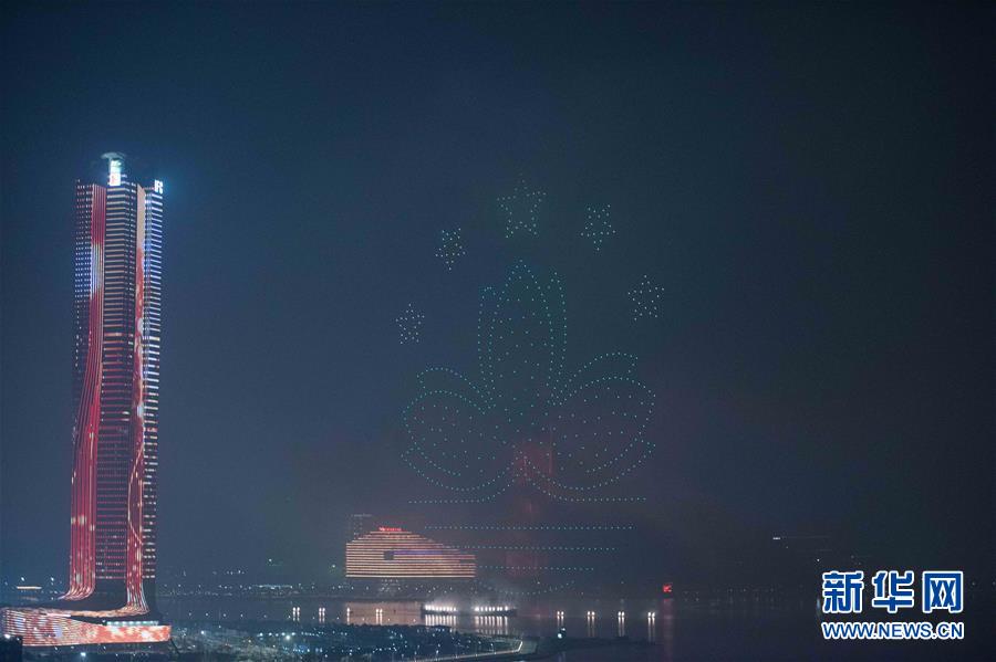 12月22日拍攝的煙花匯演上的無人機表演。當晚,澳門與珠海首次聯(lián)合舉行煙花匯演,慶祝澳門回歸祖國20周年。新華社記者張金加攝