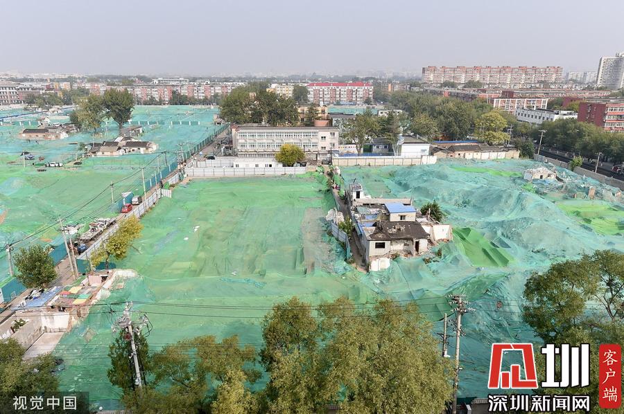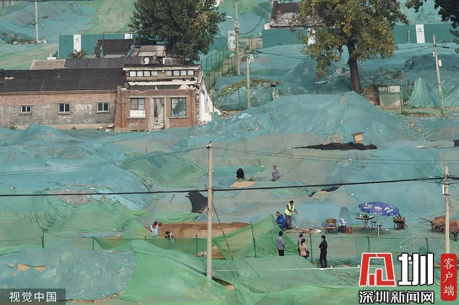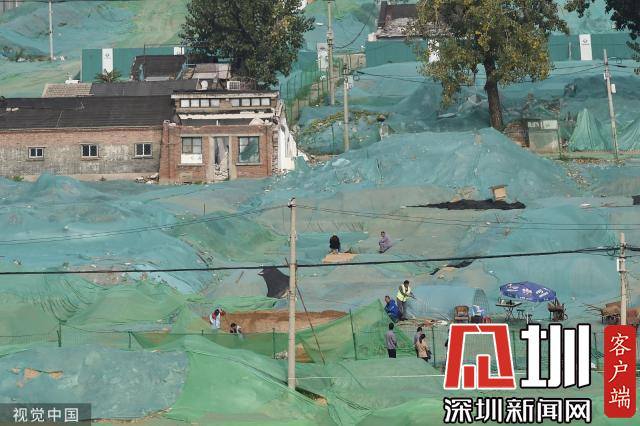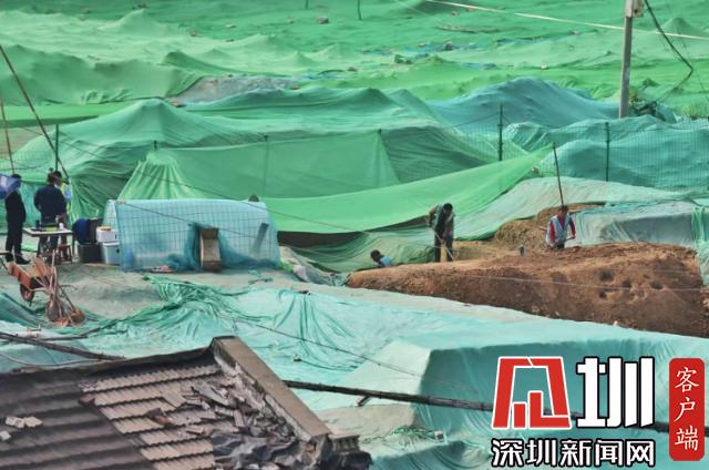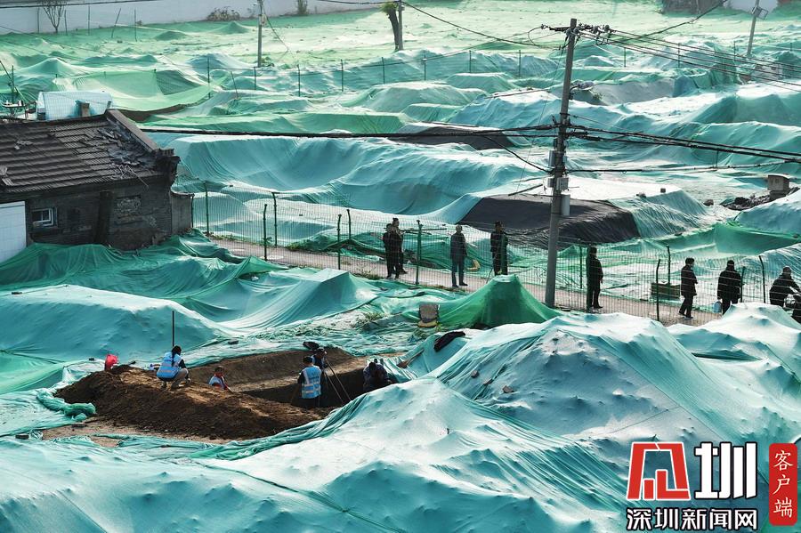 圍擋內(nèi),工地大部分被綠色苫布覆蓋,只露出幾處規(guī)整的探坑。考古工作者正在緊張忙碌中,有些工作人員戴著草帽,坐在馬扎上記錄發(fā)掘細(xì)節(jié),還有一些穿著藍(lán)色背心的工作人員使用工具正在做清理工作。