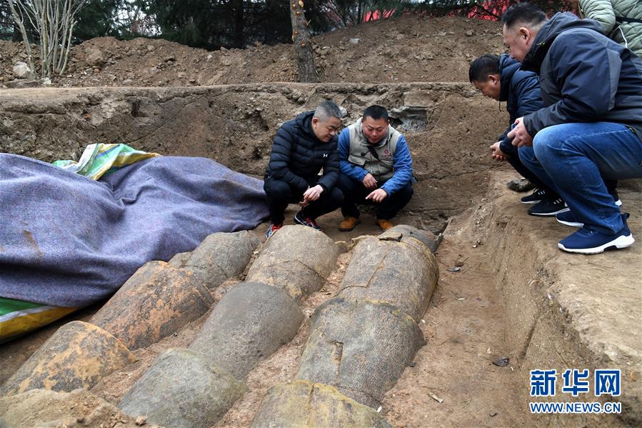 瑯琊臺(tái)遺址考古發(fā)掘現(xiàn)場(chǎng)的陶制管道(12月21日攝)。新華社記者李紫恒攝