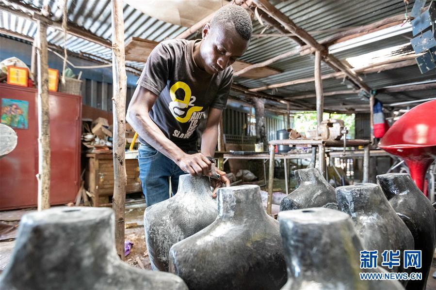 12月20日,在肯尼亞內(nèi)羅畢庫奧納藝術(shù)中心,一名藝術(shù)家制作裝置藝術(shù)作品。 新華社記者 王騰 攝