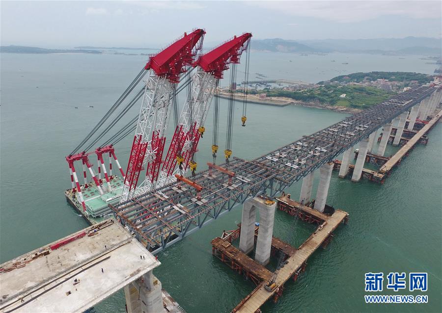 9月21日,平潭海峽公鐵大橋鼓嶼門航道橋的鋼桁梁在吊裝中(無人機(jī)拍攝)。9月25日上午,隨著一段長(zhǎng)17米、重473噸的鋼桁梁被精確固定到位,總長(zhǎng)16.34公里的平潭海峽公鐵大橋合龍貫通。平潭海峽公鐵大橋是福州至平潭鐵路控制性工程,也是“十三五”規(guī)劃中北京至臺(tái)灣高鐵的先期工程。大橋起于福州市長(zhǎng)樂區(qū),“踏”過四座小島后抵達(dá)中國(guó)第五大島平潭,上層設(shè)計(jì)為時(shí)速100公里的六車道高速公路,下層為設(shè)計(jì)時(shí)速200公里的高鐵。據(jù)福建福平鐵路公司介紹,大橋計(jì)劃2020年正式通車。在六年建設(shè)過程中,平潭海峽公鐵大橋所應(yīng)用研發(fā)的多項(xiàng)技術(shù)、裝備創(chuàng)下國(guó)內(nèi)外紀(jì)錄。新華社記者林善傳攝