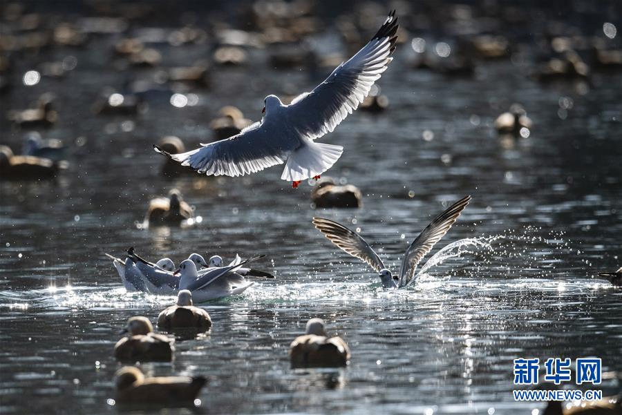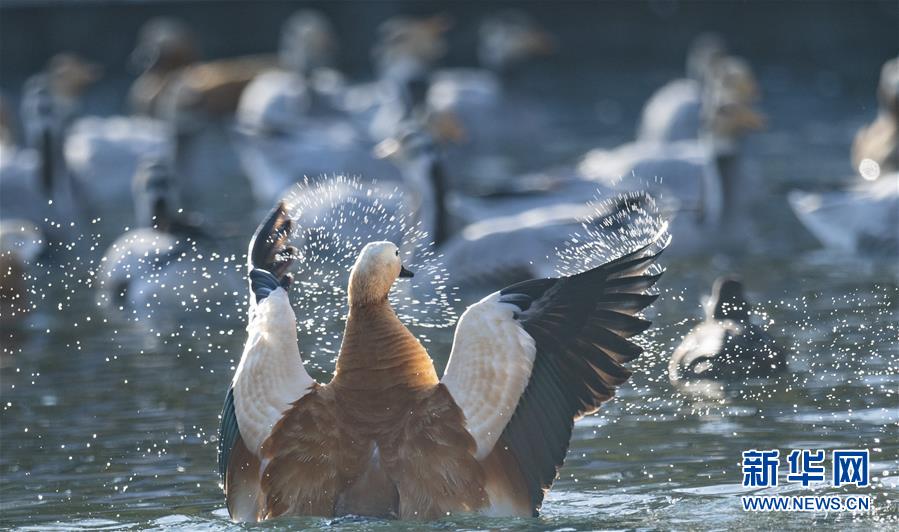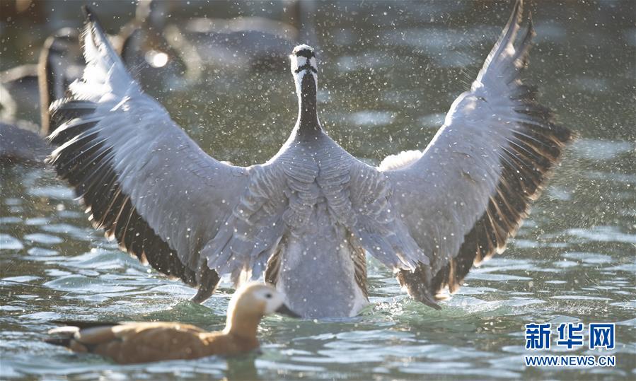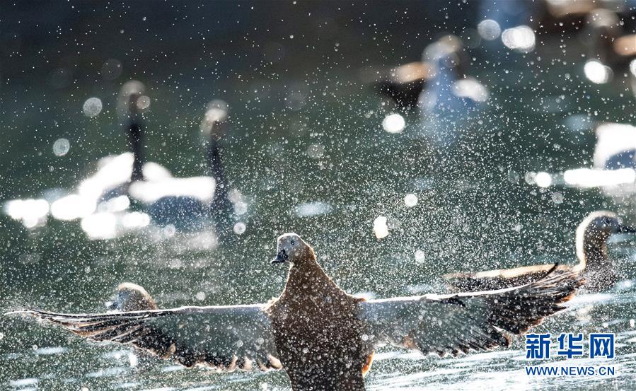 11月21日,候鳥在拉薩龍王潭公園水中嬉戲。時下,斑頭雁、紅嘴鷗等不少候鳥陸續(xù)飛抵拉薩河谷、雅魯藏布江沿岸等地避寒。新華社記者普布扎西攝