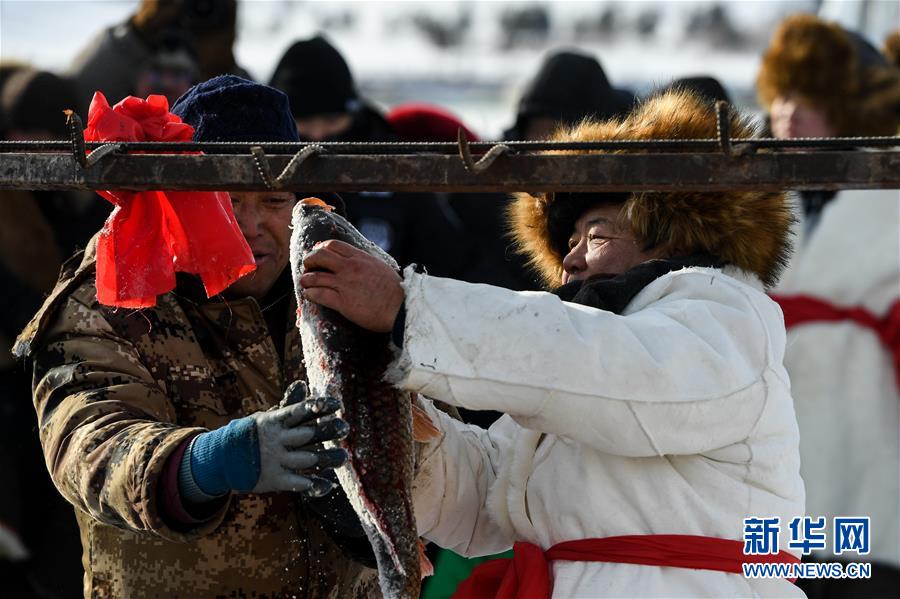 12月18日,工作人員將“頭魚”懸掛起來,準備售賣。新華社記者劉磊攝