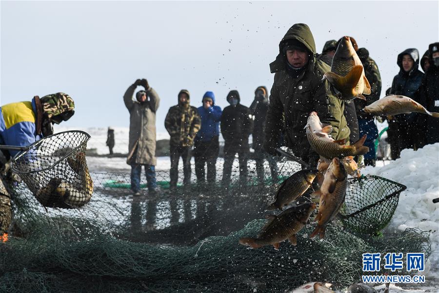 12月18日,工作人員將冬捕魚打撈上岸。當日,位于內(nèi)蒙古呼倫貝爾大草原上的諾干湖舉行冬捕活動,吸引不少游客前來觀看。冬日的諾干湖冰雪覆蓋,諾干湖冬捕也是當?shù)囟韭糜蔚奶厣顒又弧P氯A社記者劉磊攝