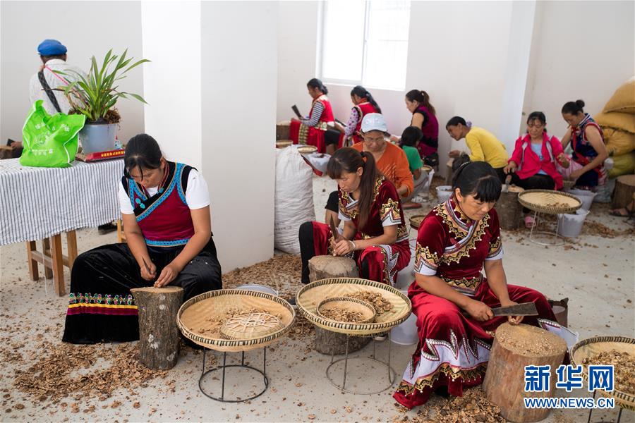在大興地鎮(zhèn)維拉壩“珠海小區(qū)”內(nèi)的農(nóng)產(chǎn)品加工扶貧車間,村民們在剝核桃仁(6月24日攝)。新華社記者胡超攝