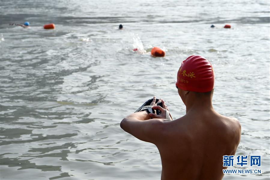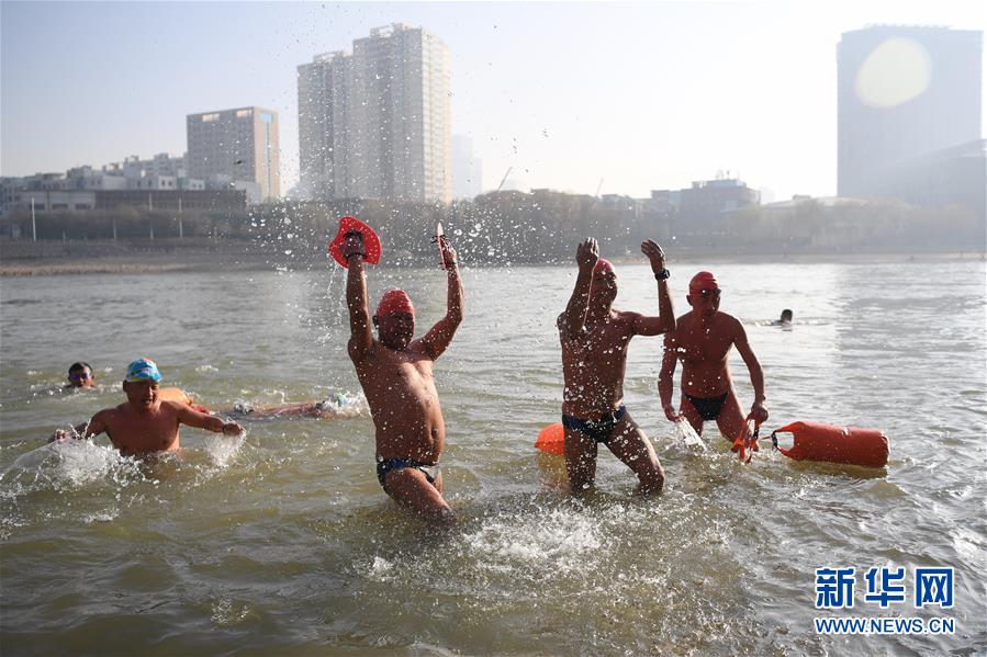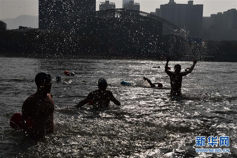 12月19日,在蘭州市馬拉松文化主題公園附近的黃河岸邊,冬泳愛好者入水準備冬泳。新華社記者馬寧攝