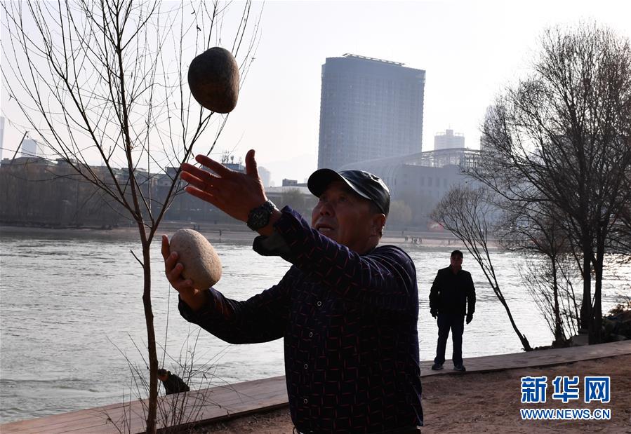 12月20日,冬泳愛好者趙子銀冬泳后在岸邊扔石頭暖身。新華社記者賀長山攝