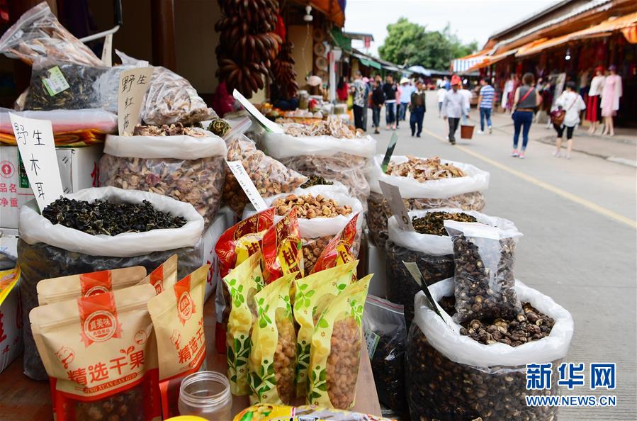 在龍巖市永定區(qū)湖坑鎮(zhèn)高頭鄉(xiāng)高北村的土樓風情一條街,當地村民把自己生產的各式農產品向參觀游客進行銷售(5月4日攝)。新華社記者魏培全攝