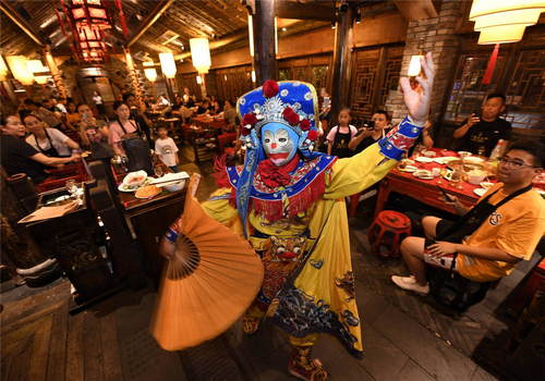 2019年8月4日,食客在四川省成都市寬窄巷子景區(qū)內的一家火鍋店觀看“變臉”表演。新華社記者劉坤攝