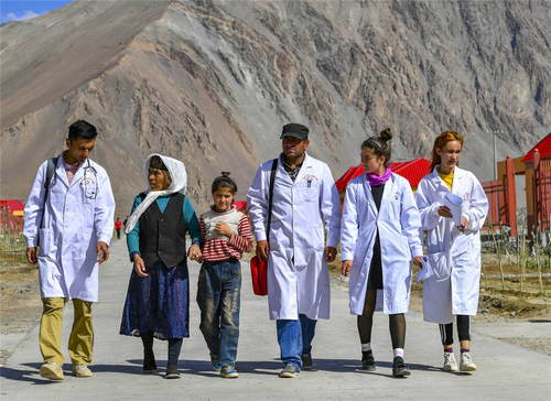 2019年7月7日,新疆塔什庫爾干塔吉克自治縣達布達爾鄉(xiāng)熱斯喀木村村醫(yī)發(fā)爾亞特·塔西白克(右三)與來自鄉(xiāng)衛(wèi)生院的醫(yī)務人員來到熱斯喀木村易地扶貧搬遷安置點出診。從過去騎著馬深入大山牧場巡診,到現(xiàn)在定期前往集中居住點上門服務;從過去幾種簡單的常備藥,到如今種類豐富的各類藥品……新疆牧區(qū)的醫(yī)療條件和水平大幅提升,牧民享受到越來越多、越來越便利的醫(yī)療惠民服務。新華社記者胡虎虎攝